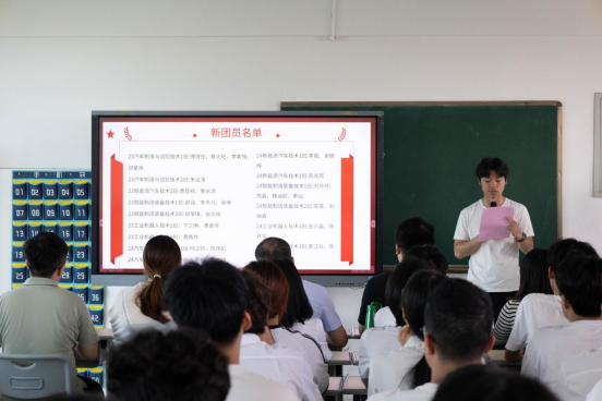 在颁发《团员证》、佩戴团徽的环节,新团员代表们有序上台,辅导员亲自为他们颁发证书、佩戴团徽,标志着这些青年正式成为共青团的一员。团员青年们高举右拳,在鲜艳的团旗下,在季昌文老师的带领下,庄严宣读入团誓词,誓言铿锵有力,表达了他们为共产主义事业奋斗终身的决心。