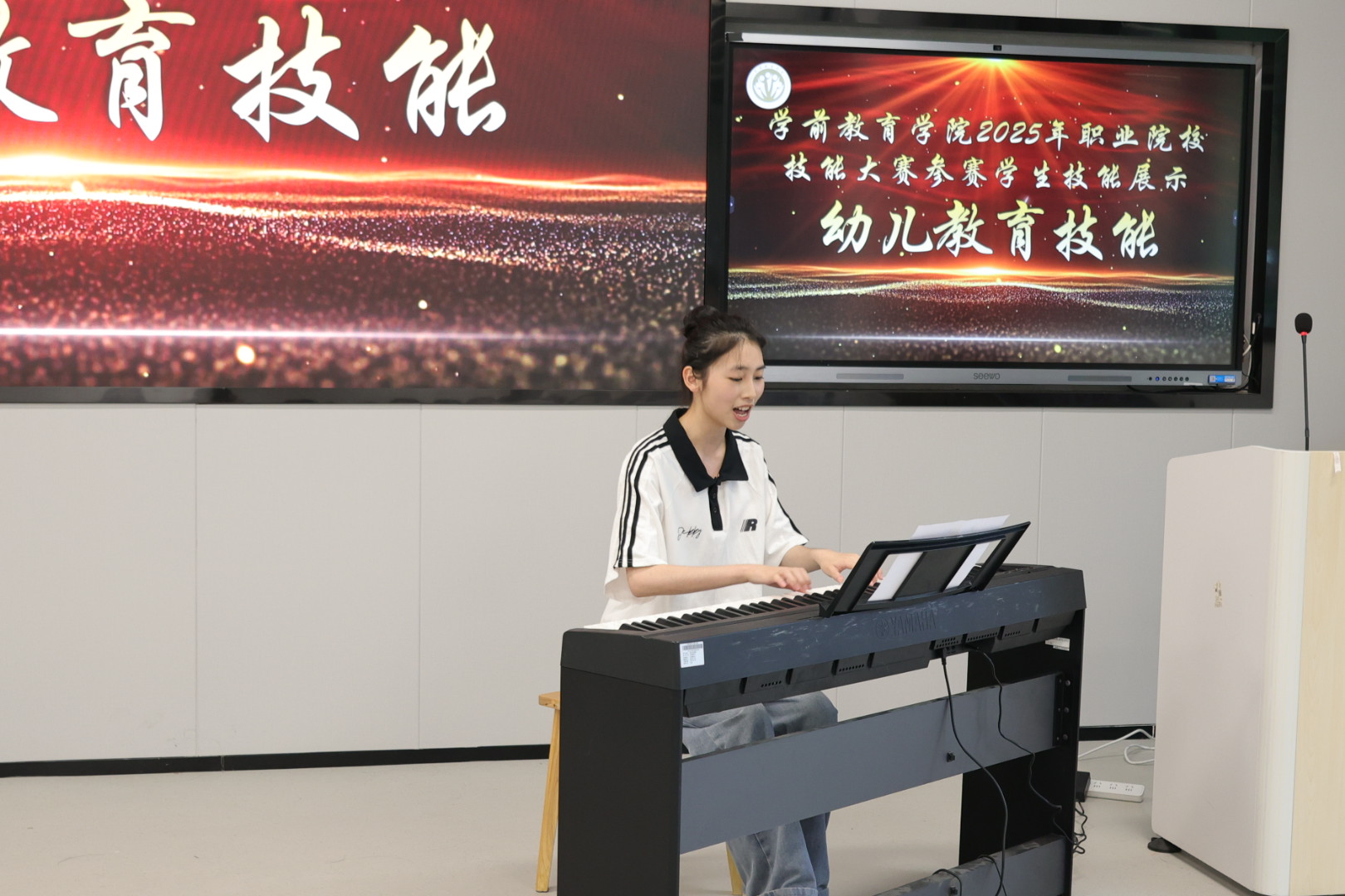 在技能展示环节,2025年福建省职业院校技能竞赛的参赛学生们展示了幼儿教育技能、婴幼儿照护技能以及婴幼儿健康养育照护技能。选手们凭借扎实的专业知识和熟练的操作技能,赢得了在场师生的阵阵掌声,彰显了学前教育学院的教学实绩。