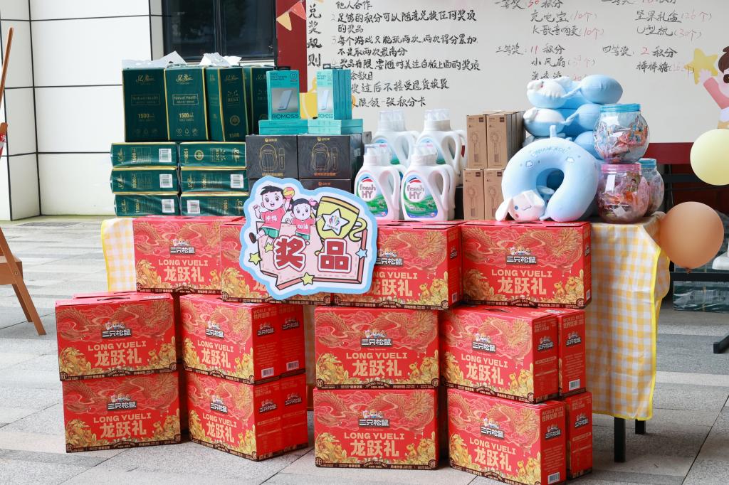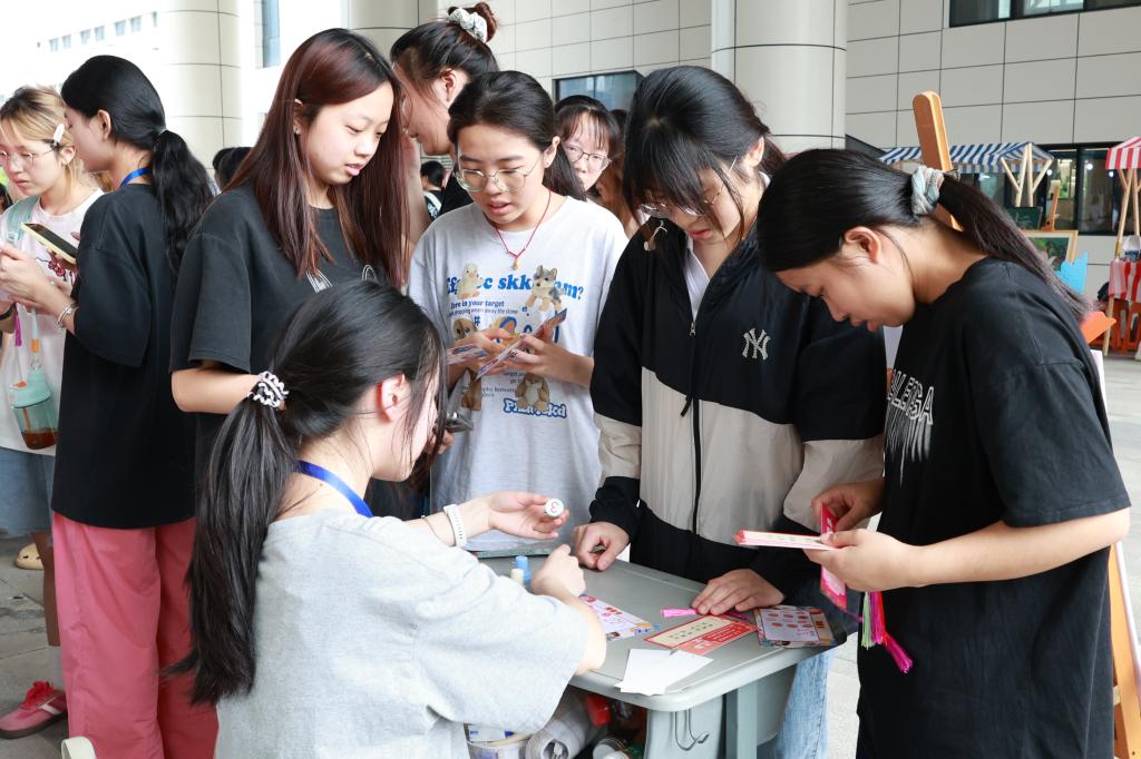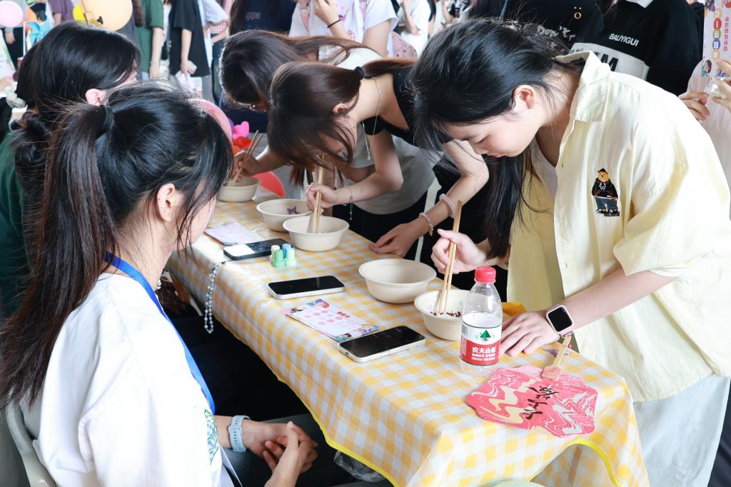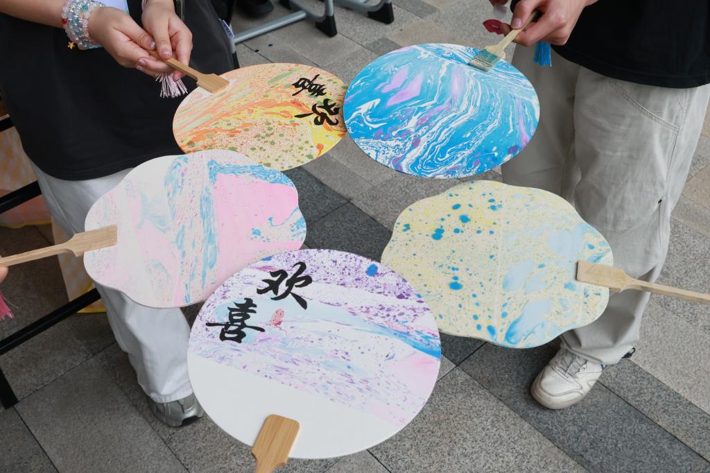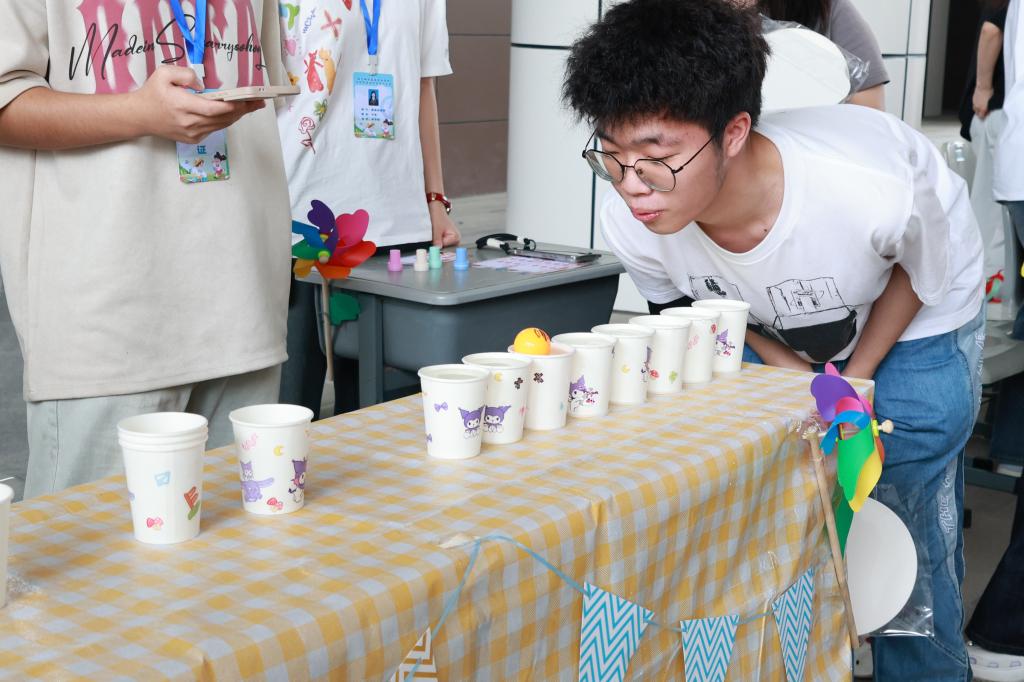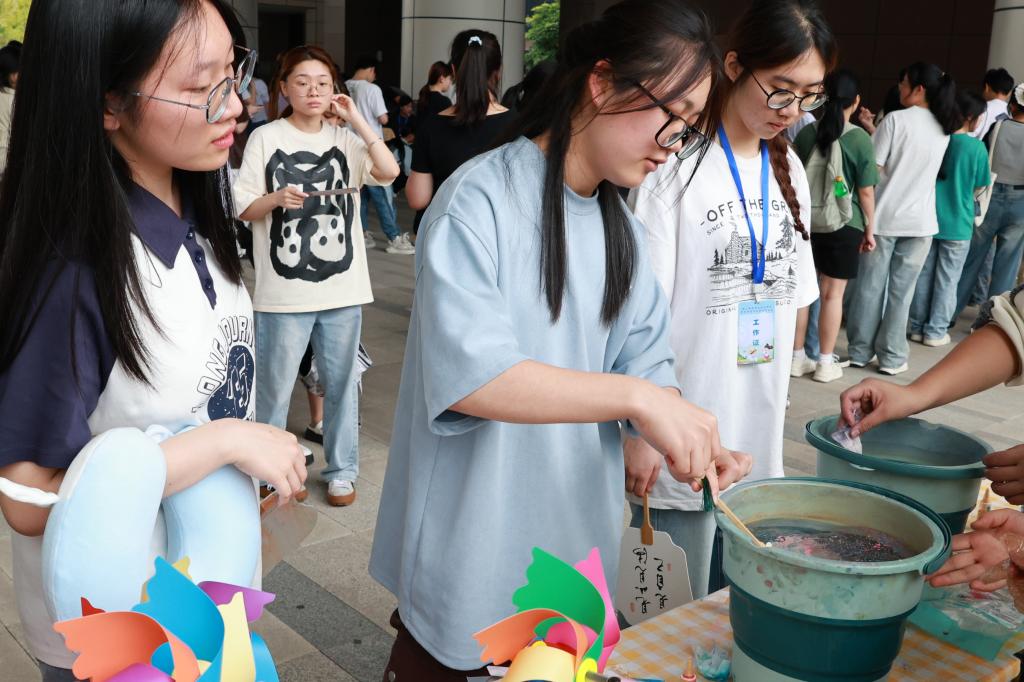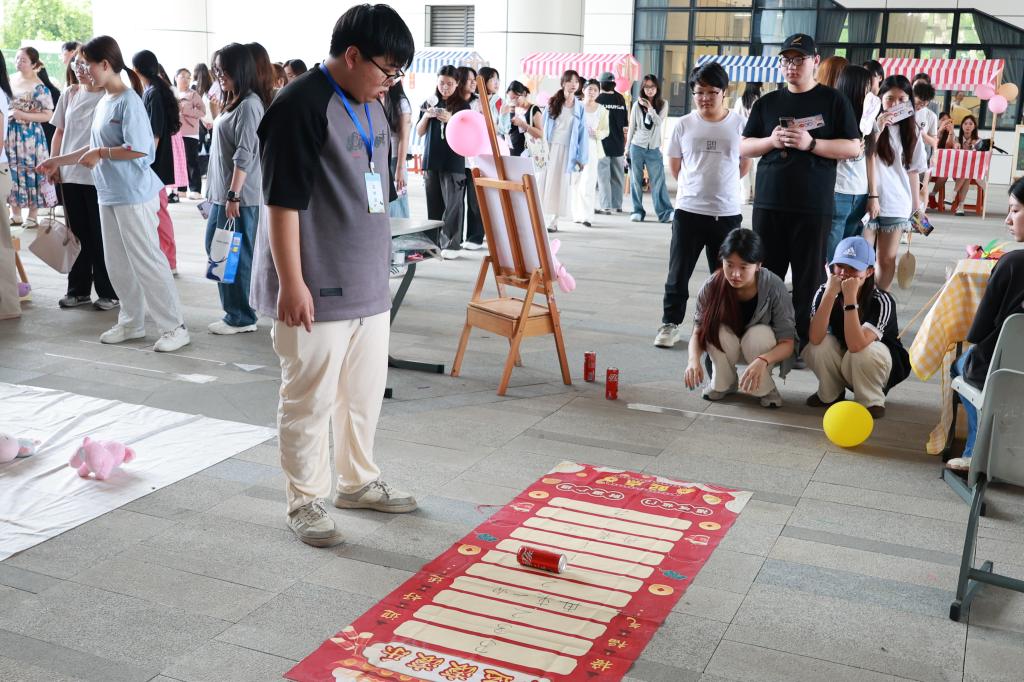 本次游园会设置了六大童趣关卡和两大手作工坊体验区。六大关卡各具特色,有推动饮料瓶定乾坤的“好运滚滚乐”,精准投射赢积分的“趣味套圈圈”,考验技巧与耐心的水上漂移计时赛“吹球大作战”,智慧比拼的“灯谜猜猜乐”,以及筷子夹红豆的“红豆妙手侠”和纸飞机投掷竞技的“纸翼飞扬赛”。两大手作工坊也备受青睐,在“珠光宝串”区,师生们用五彩珠子串出专属手链、项链;“彩漆扇艺”区,大家旋转团扇沾取彩漆,让团扇变得绚丽多彩。