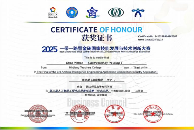 11月14日至16日,由金砖国家工商理事会中方理事会、“一带一路”暨金砖国家技能发展国际联盟等单位主办,武昌职业学院等单位联合承办的2025“一带一路”暨金砖国家技能发展与技术创新大赛之第三届人工智能工程化应用赛项(行业应用)决赛在武昌职业学院顺利收官。历经激烈角逐,我校物联网应用技术专业林雨欣同学(指导教师:叶宁)和陈艺祯同学(指导教师:叶宁)凭借扎实的技术功底,在工程实践环节发挥稳健,斩获两个三等奖。