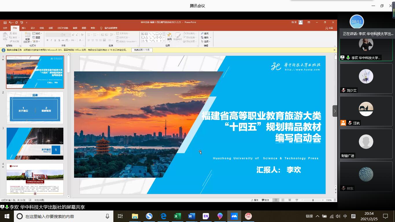 2月25日,人文系副主任刘少艾、导游教研室负责人谢颖及导游教研室全体教师以线上会议的形式参加福建省职业教育旅游大类“十四五”规划教材编写启动会暨首场审纲会。专家顾问郑耀星教授、旅游职业教育行业指导委员会刘松林教授、华中科技大学出版社旅游分社李欢社长及福建省高职中职院校旅游类专业负责人及骨干教师参加会议。