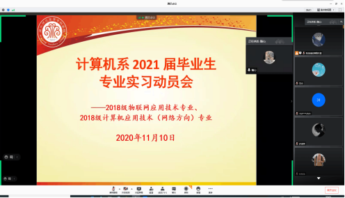 为进一步推进2021届毕业生各项工作,11月10日晚,计算机系通过腾讯会议组织召开了2021届毕业生线上专业实习动员大会。计算机系副主任王华、副主任冯光、各教研室主任、毕业班辅导员、2021届全体毕业生参加了会议。会议按专业分两场组织召开,并由冯光副主任主持。