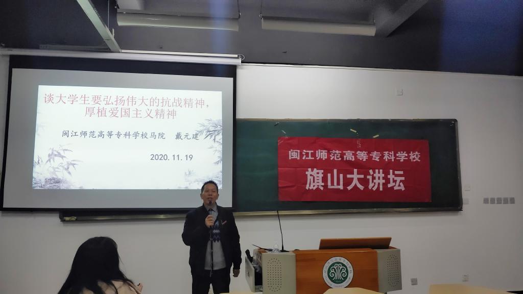 12月15日,我校马克思主义学院戴元建老师在仓山校区2号楼701教室为计算机系20级新生开展题为《大学生要弘扬伟大的抗战精神,厚植爱国主义情怀》的“旗山大讲坛”。