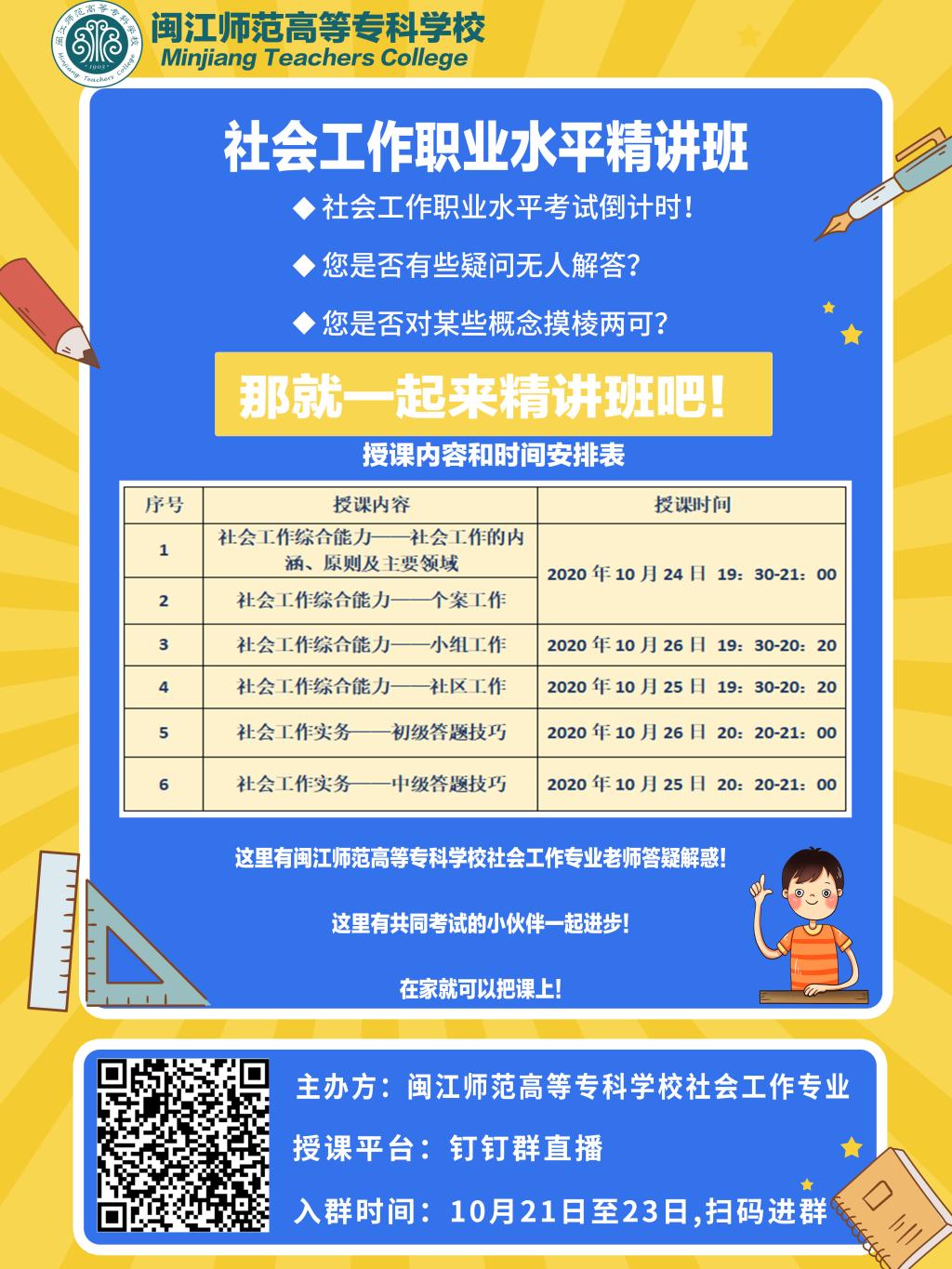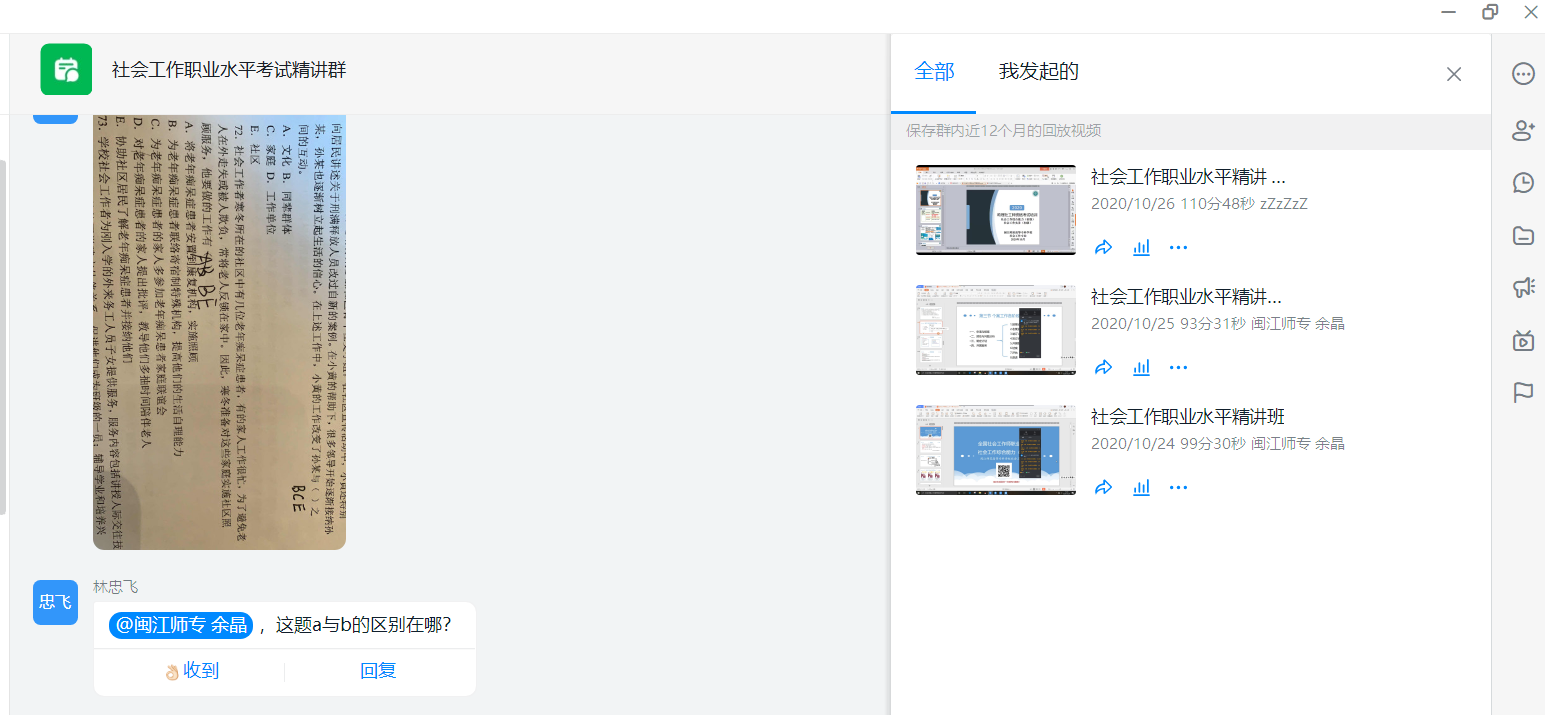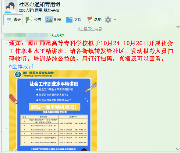 人文社科系社会工作专业关注行业发展,助力社会工作者成长,充分发挥专业优势开展社会服务。10月24—26日我系社会工作专业教师团队面向福州市广大社区工作者和社会服务机构人员开展线上社会工作职业水平公益精讲班。前期调研发现大部分人对于社会工作个案、小组和社区三大方面知识点存在模糊或是不好理解的情况,为此社会工作专业教师团队经过精心备课,对于学员的诉求精准开展培训工作。本次公益精讲班得到福州市鼓楼区、晋安区和马尾区社区办的大力支持,共有160余人进群听课。平台形成的课程回放可以反复观看,总观看人次达240人次。听课中学员与讲师进行充分的互动,形成学习场域,学员心中的疑难点也一一获得解答,。