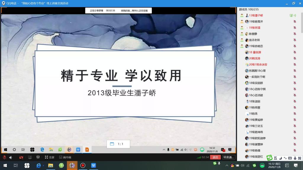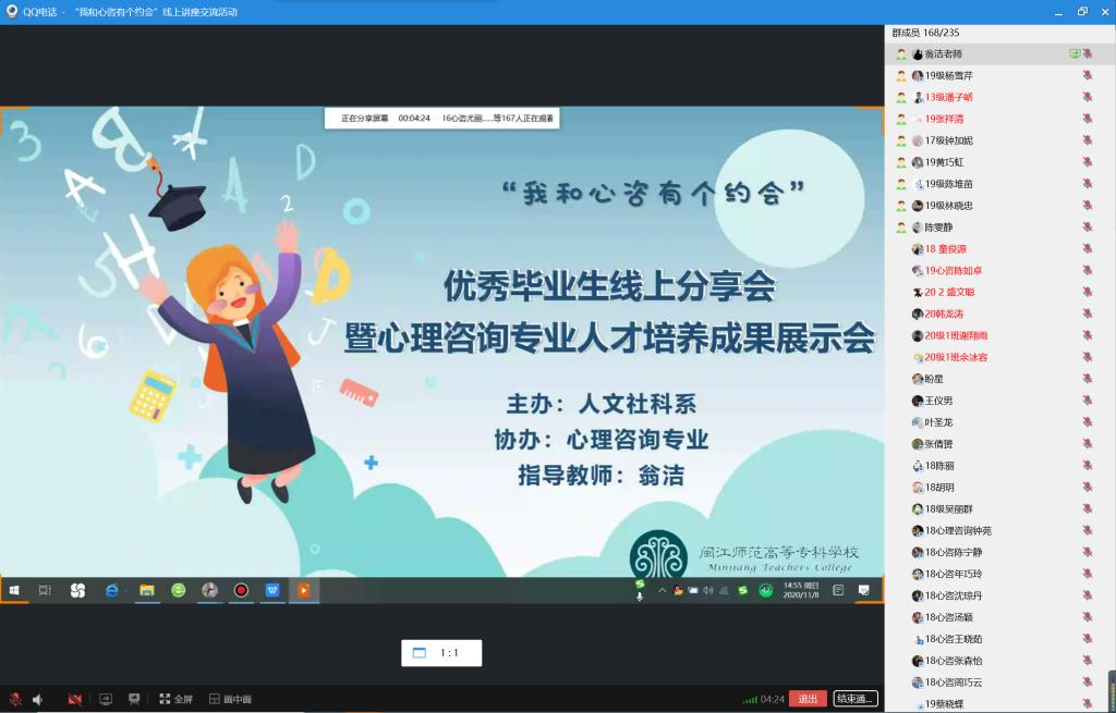 11月8日下午,我校人文社科系心理咨询专业全体师生齐聚网络,在空中电波中相聚,举办“我和心咨有个约会”优秀毕业生线上分享会。活动特邀请2013、2014、2017级心理咨询专业毕业生开展线上分享活动,通过活动展现本专业育人成果和往届优秀毕业生风采。