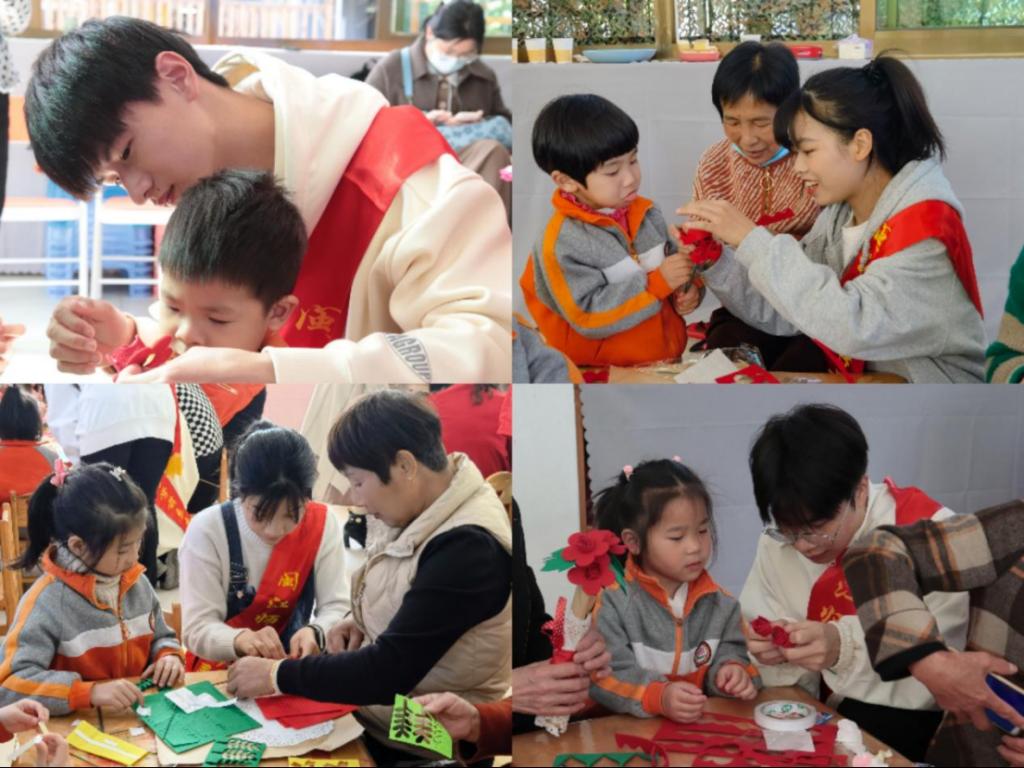 活动中,学生志愿者们,结合专业所学,组织幼儿园的小朋友和家长们开展手工DIY、击鼓传花等丰富有趣的活动,当天恰逢三八妇女节来临之际,孩子们拿着亲手制作的手工花束送给他们亲爱的奶奶和妈妈,不仅表达了亲切的节日祝福,也抒发了对长辈辛勤养育的感恩之情。亲子在志愿活动中增进情感交流,共同度过温馨难忘的一天。