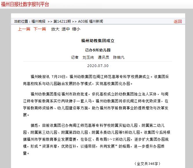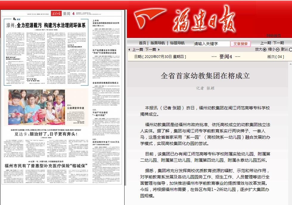 1、《福建日报》报道全省首家幼教集团在榕成立