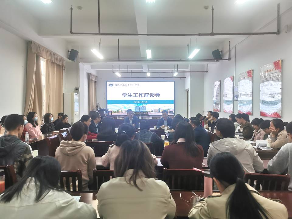 2021年11月11日,我校在旗山校区综合楼八楼党员活动室召开学生工作座谈会。校党委书记陈荣生,副校长谢敏峰携有关职能部门负责人、系部总支书记、分管学生工作副书记以及辅导员共同探讨我校学生思想政治教育工作。座谈会由学生处处长张信容主持。