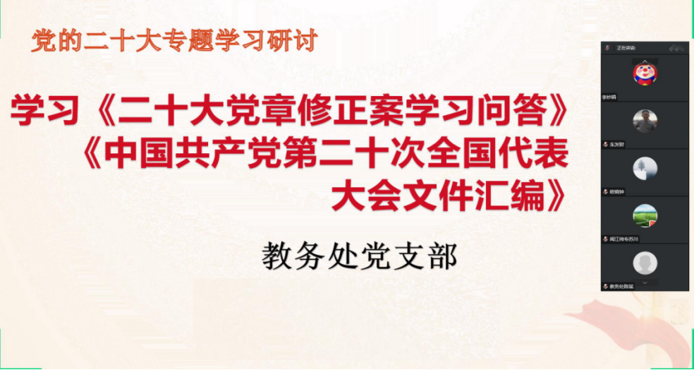 坚定不移跟党走,同心共赴新征程。近日,教务处党支部开展“学习贯彻二十大 踔厉奋发新征程”主题党日系列活动,将理论学习与实践活动相结合,在真学实干中掀起了学习贯彻党的二十大精神热潮,在学思践悟中提升了政治站位、强化了政治担当,在踔厉奋发新征程中增添了一道亮丽的色彩。