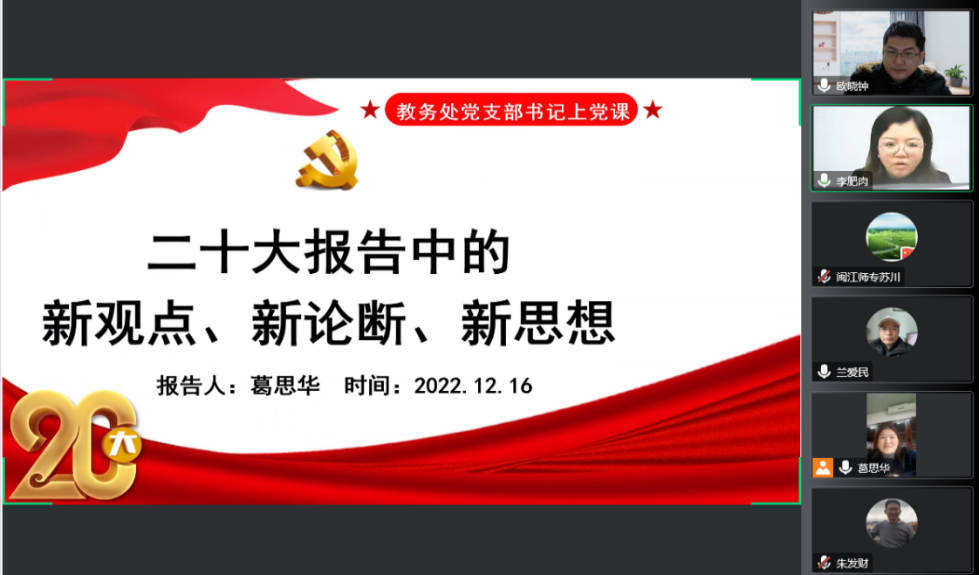 上好一堂专题党课。12月16日,葛思华为全体党员开讲一堂精彩党课,她生动解读了党的二十大报告中的“新观点、新论断、新思想”,共学报告精髓要义、金句要点。她强调支部要结合学校工作实际,以“办好师生满意的教育”为目标,深化我校“双高建设”各项工作,埋头苦干、锐意进取,以奋发有为的精神奋力书写人民满意的教育答卷,一步一个脚印把二十大作出的重大决策部署付诸行动,落到实处。