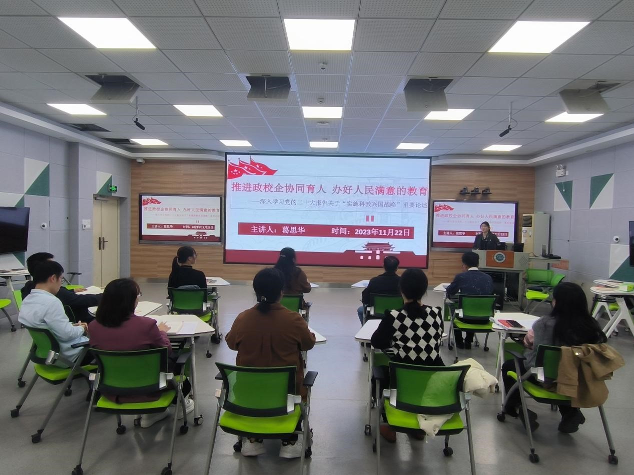 葛思华从“办好人民满意的教育”“完善科技创新体系”“加快实施创新驱动发展战略”“实施人才强国战略”四个方面对党的二十大报告中关于“实施科教兴国战略,强化现代化建设人才支撑”的重要论述作了详细解读。她还结合当前职业教育的形势与状况,分析了“政校企协同育人”新型人才培养模式在资源共享和优势互补方面的特点,希望党员干部积极发挥自身优势和作用,加强校企合作交流,共同推动创新发展,为“办好人民满意的教育”贡献力量。