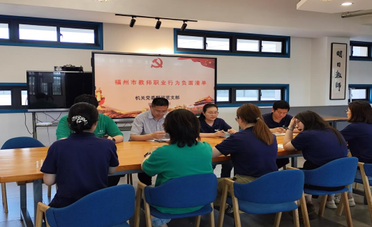 为扎实推进深入贯彻中央八项规定精神学习教育,进一步增强教师职业道德意识、规范执教行为,7月15日,群团党支部第二党小组组织全体教职工开展集中学习会暨主题党日活动,活动由党员同志领读,重点学习了《新时代高校教师职业行为十项准则》和《福州市教师职业行为负面清单》。