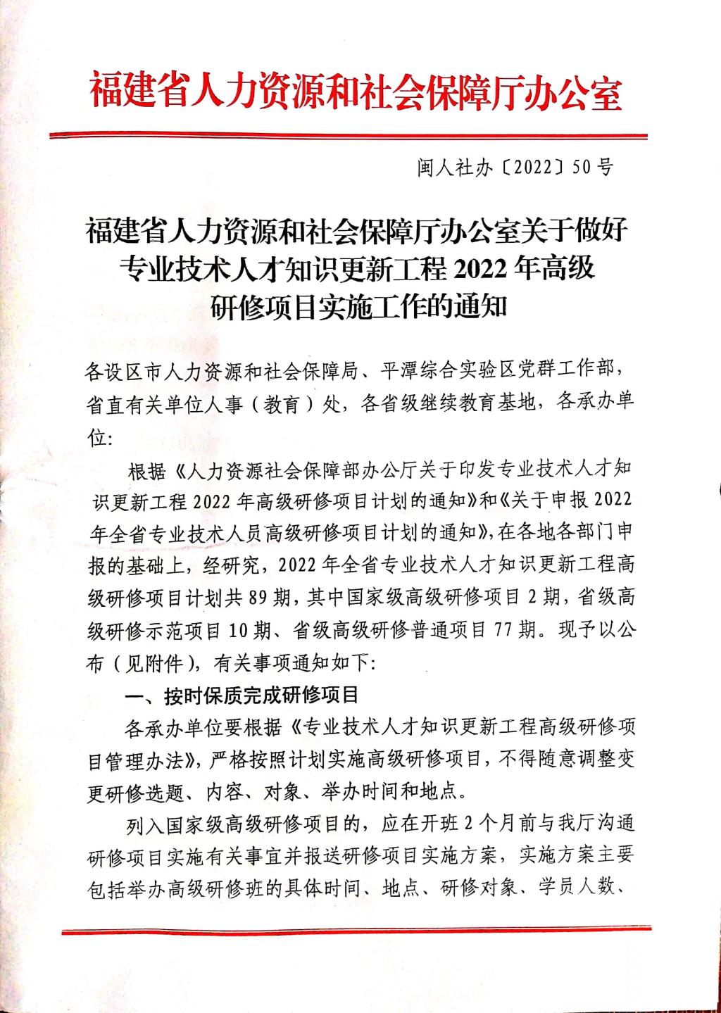 近日,福建省人力资源和社会保障厅办公室公布了《关于做好专业技术人才知识更新工程2022年高级研修项目实施工作的通知》(闽人社办〔2022〕50号)。根据《通知》,2022年全省专业技术人才知识更新工程高级研修项目计划共89期,其中国家级高级研修项目2期,省级项目87期。我校申报的《长乐区中小幼专兼职责任督学高级研修班》等4个项目已获批省级项目。