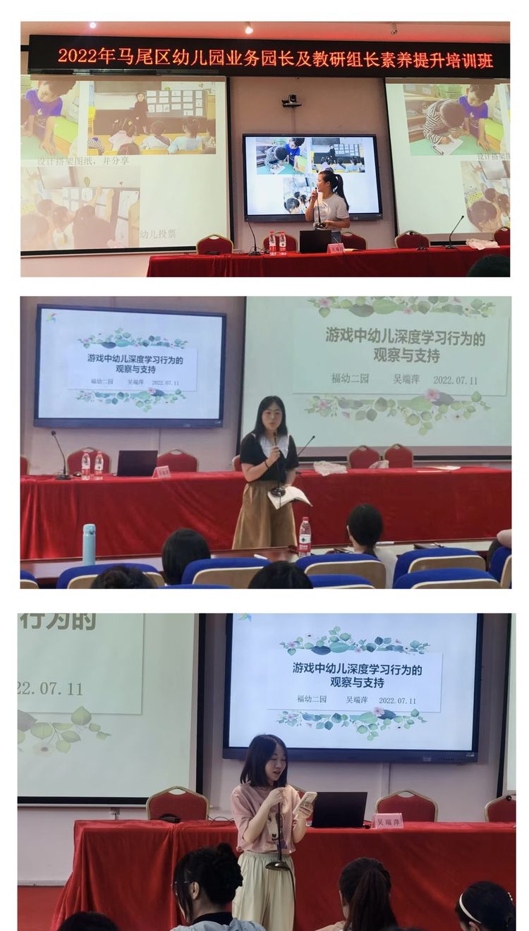 下午,福建省幼儿师范高等专科学校附属二园吴端萍园长为学员们带来了题为《游戏中幼儿深度学习行为的观察与支持》培训内容。前半场吴园长以讲座的形式介绍深度学习的缘起、幼儿深度学习的特征和深度学习的支持策略,为学员们提供了观察幼儿深度学习的两个抓手——幼儿深度学习维度特征表、支持幼儿深度学习游戏环境的核心要素表。