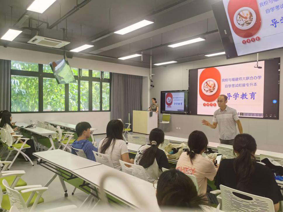 为助力福建师范大学、福建医科大学自考“专本衔接” 学生科学规划学习任务、快速适应学习要求,从而高效通过自考本科课程,实现“专科毕业时同步取得自考本科毕业证书并申请相应学士学位证书”的目标,我院于2025年9月17日下午在闽江师范高等专科学校旗山校区产创楼103教室,面向2025级下半年自考 “专本衔接” 新生开展导学教育活动。