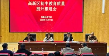 为全面总结分析高新区各初中学校教学质量情况,进一步明方向、查弱项、找方法、补短板,制定切实有效的备考策略,进一步凝聚合力、真抓实干、提升质量,12月11日,区教卫局召开初中教育质量提升推进会。区教卫局局长陈昕、主任江欢、教科所所长蔡勤等出席会议并讲话,全区各初中学校校长、教学副校长、教务主任,年段长等参加会议。