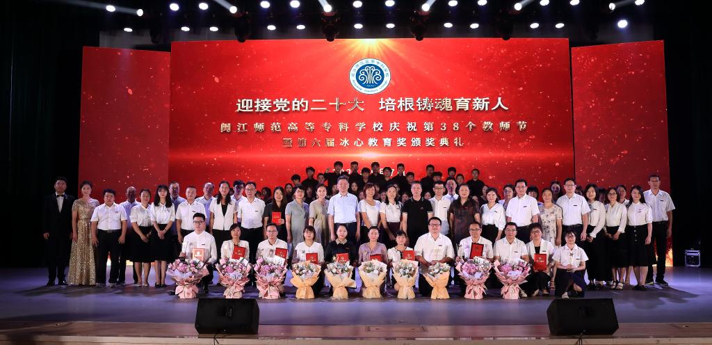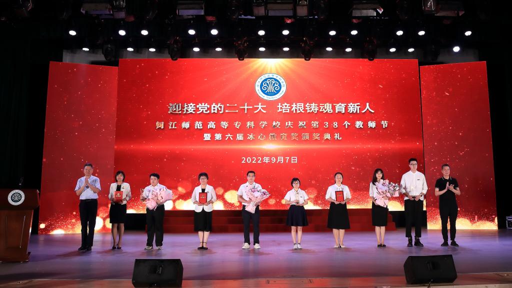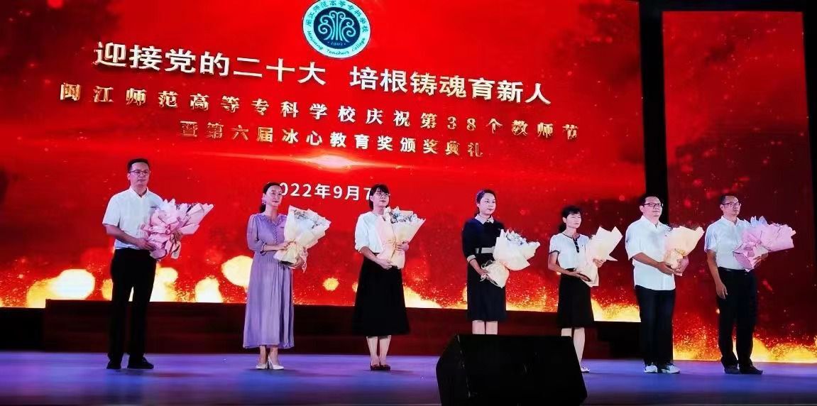 党委副书记林旻宣读《闽江师范高等专科学校关于第六届“冰心教育奖”评选结果的通知》。与会领导给2021-2022学年度校先进工作者、从事教育事业年限男满30周年(女满25周年)的教师、第六届“冰心教育奖”获得者颁发证书。