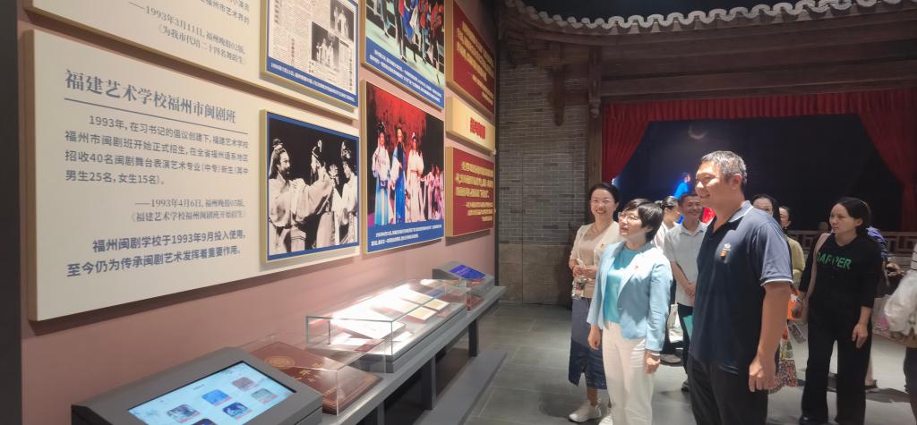 在振兴闽剧展板前,大家深切感受到习近平总书记主政福州期间,对振兴闽剧、繁荣文化的高度重视。1993年,在习近平总书记的关心支持下,福建艺术学校福州市闽剧班开始正式招生,在全省福州语系地区招收40名闽剧舞台表演艺术专业(中专)新生(其中男生25名,女生15名),而艺术学院副院长林理杰就是其中的一名男生。在场的闽剧教师们纷纷表示在新形势下要不忘初心、牢记嘱托,进一步推动闽剧艺术的创造性转化、创新性发展,打响闽都文化国际品牌,以“时不我待,只争朝夕”的实干快干精神助力非遗闽剧艺术薪火相传。