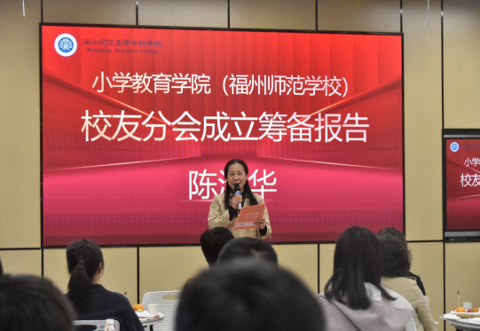 小学教育学院院长张宁代表学院向大会致辞。她对各位校友嘉宾的到来表示热烈的欢迎,与校友共同回顾了闽江师专120年的办学历程,梳理了近年来学院在学科建设、专业发展、人才培养和社会服务等方面取得的丰硕成果。小学教育学院党总支书记陈淑华做校友分会成立筹备情况报告,对广大校友的热心参与和积极支持表示感谢,并表示学院将进一步加强与校友之间的联系,建立稳固的合作、沟通机制,欢迎校友常回家看看,共同推动学院发展。