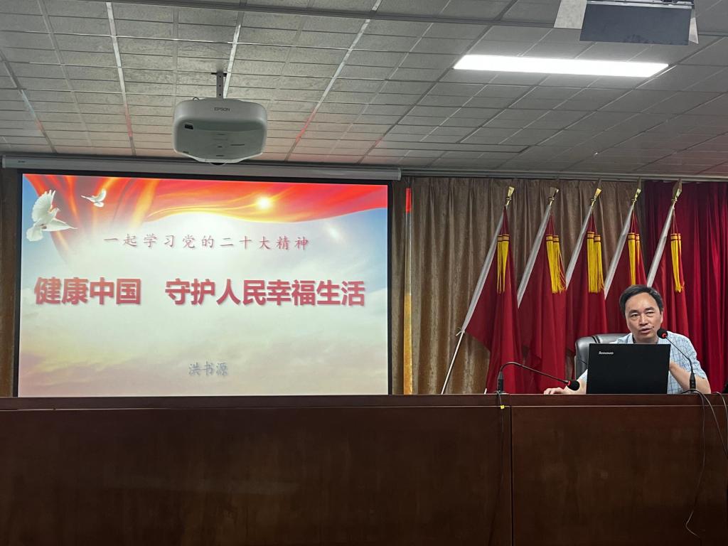 最后,闽江师专马克思主义学院院长、教授洪书源以“健康中国 守护人民幸福生活”为题作党的二十大精神宣讲报告,进一步梳理了党的二十大报告提出的新表述、新概括、新论断,从历史维度、理论维度和实践维度解读健康中国战略,引导全体党员干部从中汲取精神力量,推动党的二十大精神在党员队伍中落地生根。