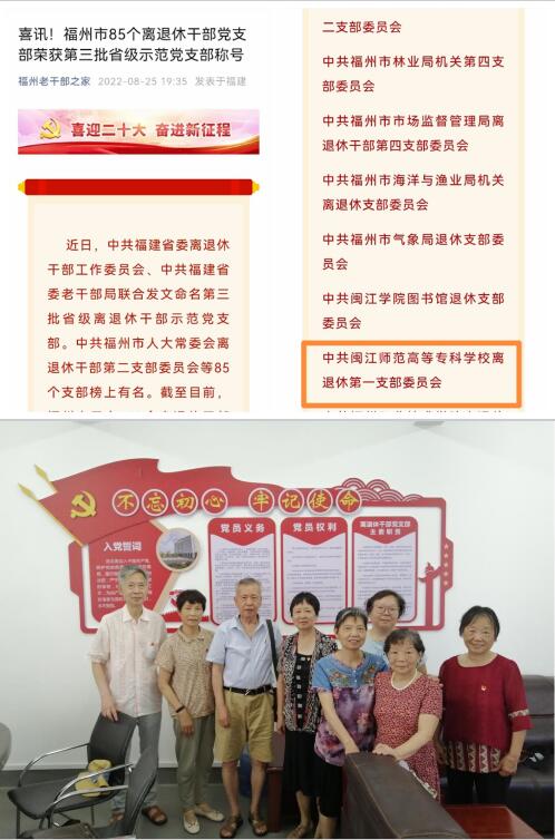 近日,中共福建省委离退休干部工作委员会、中共福建省委老干部局联合发文命名第三批省级离退休干部示范党支部。我校离退休第一党支部荣获“省级离退休干部示范党支部”称号。
