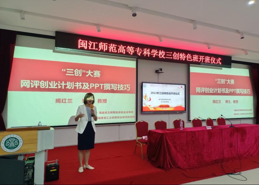 开班仪式结束后,揭红兰教授为21支晋级三创特色班的项目团队成员,进行《网评版项目计划书及PPT制作技巧》 专题讲座。