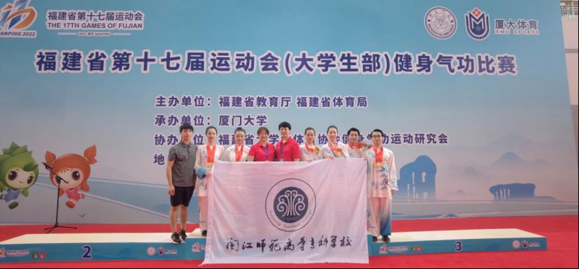 7月16-18日,由福建省教育厅、福建省体育局主办的第十七届福建省运动会大学生部丙组健身气功比赛在厦门大学落下帷幕。由谢群喜、薛庆云两位老师和陈思慧、骆翊东、龙莉娜、王静怡、甘晶晶、郭冠贤6位学生组成的我校健身气功代表队参加此次比赛,共取得了5金1银1铜的优异成绩,金牌数、奖牌总数皆位居全省第一。同时,指导教师谢群喜荣获“优秀教练员”荣誉称号,我校荣获福建省“体育道德风尚奖”单位。