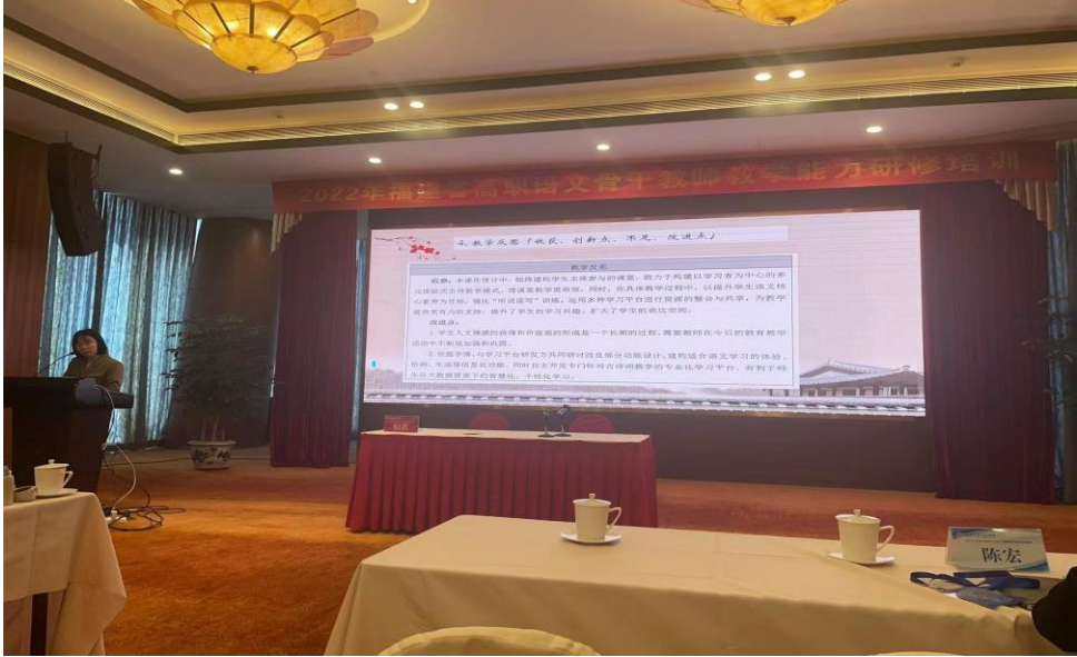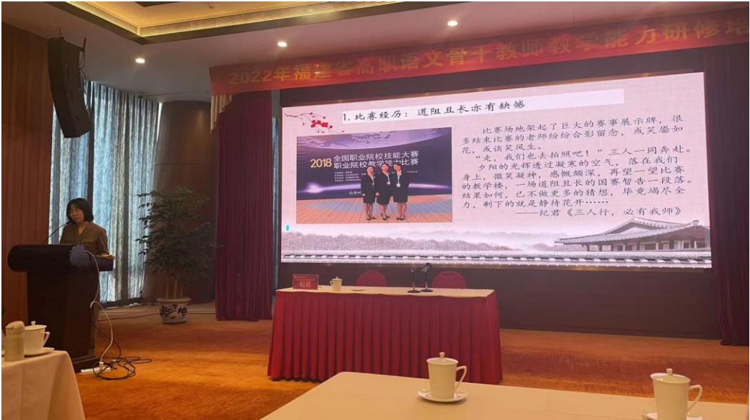 2022年10 月 24 日上午8:30,闽江师范高等专科学校公共基础部语文教研组纪君老师在福州福清融侨酒店会议厅为2022年福建省高职语文骨干教师能力研修国培班学员带来了题为“全国职业院校教学设计经验分享”的精彩讲座。讲座由福建技术师范学院黄海燕老师主持。纪君老师主要从“全国职业院校技能大赛教学能力比赛”国赛经验及备赛策略、国赛视域下《大学语文》教学设计思考和国赛反思三个角度进行剖析,学员们受益匪浅。