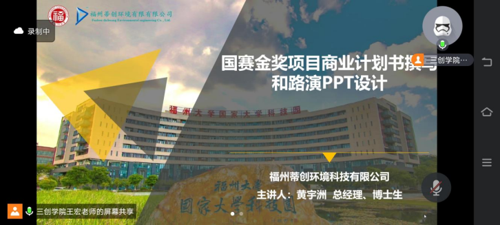 为引导我校青年学子不断提升就业创业能力,全力做好2024年中国国际大学生创新大赛的备赛工作,6月26日下午,我校在旗山校区E-106开展2024年企业家进校园活动。特邀福州蒂创环境科技有限公司总经理、福建省人社厅创业导师、第九届“创青春”中国青年创新创业大赛年度总冠军黄宇洲开展《国赛金奖项目商业计划书撰写和路演PPT设计》专题讲座,各学院近100名师生代表参加,24年中国国际大学生创新大赛参赛师生在腾讯会议同步收看,活动由创新创业教研室主任王宏老师主持。
