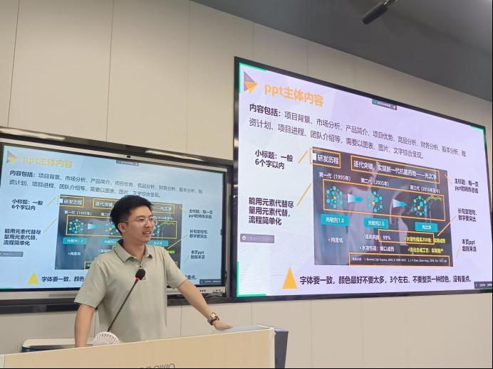 讲座伊始,黄宇洲经理首先介绍了商业计划书在创新创业项目中的重要性。他强调,一份优秀的商业计划书是项目的灵魂、决策的关键。接着,黄经理详细讲解了商业计划书的撰写要点,包括市场分析、产品服务、营销策略、团队介绍等方面,并结合实际案例进行了深入剖析。在路演PPT设计方面,也给出了宝贵的建议。他指出,路演PPT是展示项目亮点、吸引投资者关注的重要工具,因此设计时要注重简洁明了、重点突出,他还分享了一些实用的PPT素材资源。