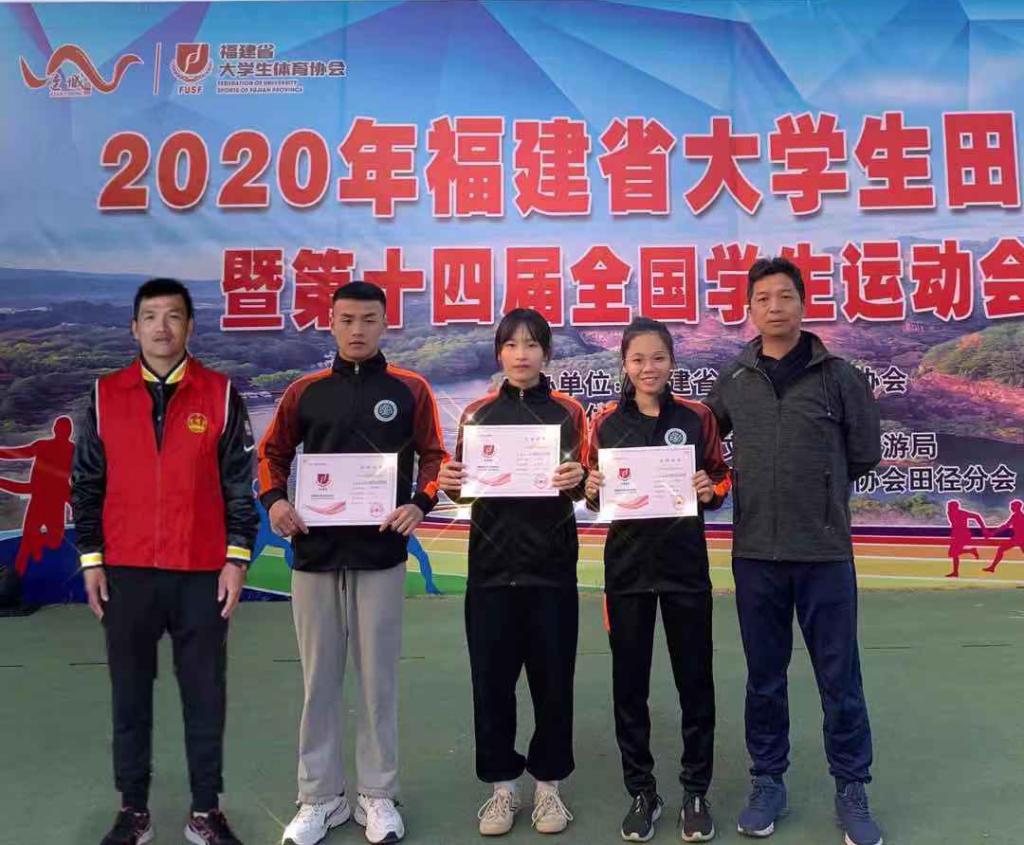 2020127日至9日,福建省大学生田径锦标赛第十四届全国学生运动会选拔赛在龙岩连城举行,我校田径队由公共基础部主任薛庆云担任领队,李劲老师和林碧娟老师组成的教练带领我校三名运动员参赛。经过三天的激烈角逐,我校三名运动员不负众望,脱颖而出,再创佳绩。其中19级艺术系的徐裕欣同学荣获女子400米第一名、200米第二名20级初教系的陈沁怡同学荣获女子1500米第二名、800米第三名19级机电系的乐占仓同学荣获男子跳远第二名、100米第四名(达二级运动员水平)。在每个学校可以报十五名运动员的情况下,我校以三名运动员之力荣获总分41分,团体第七名的好成绩,为学校争得荣誉!
