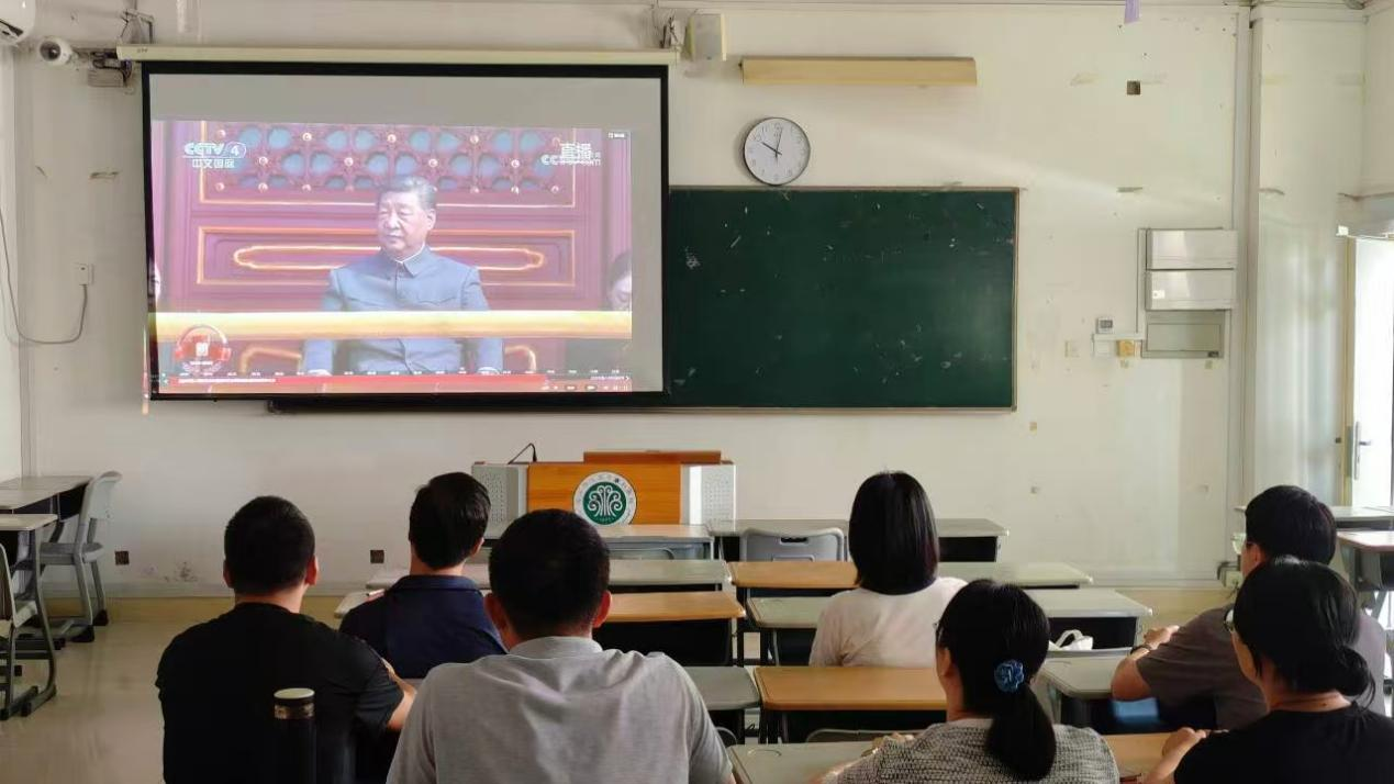 2025年9月3日上午9时,纪念中国人民抗日战争暨世界反法西斯战争胜利80周年大会在北京隆重举行。通识教育学院在旗2-2001教室组织党员教师们集中观看了大会直播,共同回顾那段波澜壮阔的抗战历史,缅怀先烈,汲取奋进力量。