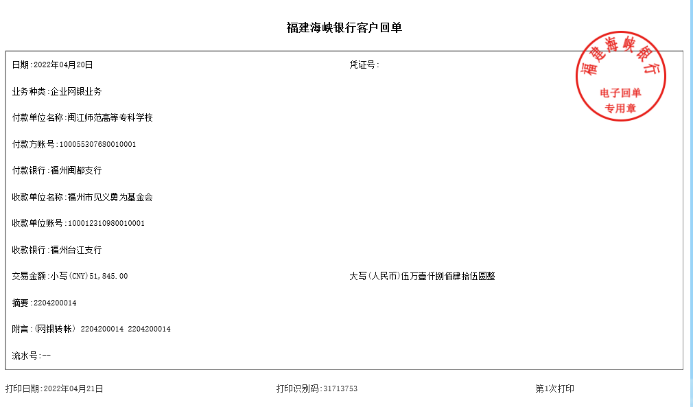 2022年4月份,闽江师专工会积极响应榕义委〔2022〕3号《向福州市见义勇为勇士捐款献爱心的倡议书》号召,向全体在职和离退休教职员工提出倡议,动员广大教职员工慷慨解囊,积极向见义勇为勇士捐款献爱心,为创造平安和谐福州做出自己的一份贡献。