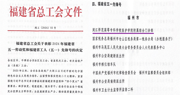 近日,福建省总工会公布了《关于表彰2024年福建省五一劳动奖和福建省工人(五一)先锋号的决定》,我校医护学院附属综合门诊部光荣上榜,荣获2024年福建省五一先锋号荣誉称号。