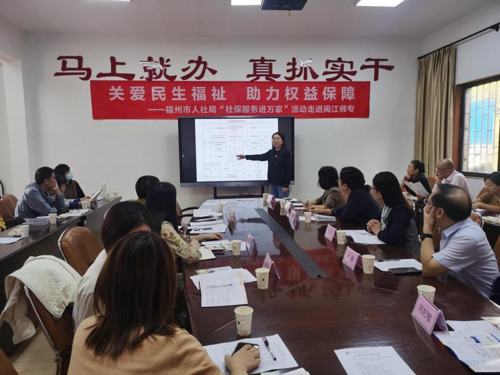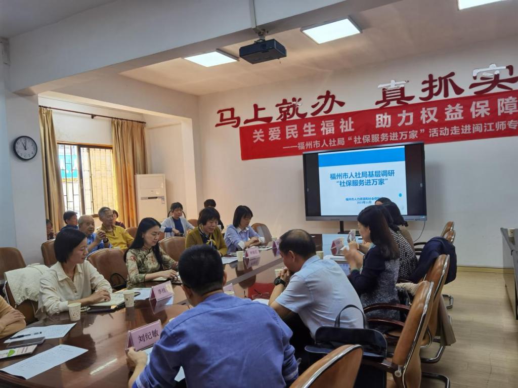 11月8日上午,校工会(机关党委、老干科)、人事处(教师工作部)联合福州市人力资源和社会保障局在光禄坊校区举办了一场“关爱民生福祉,助力权益保障”主题教育专题调研暨“社保服务进万家”活动。福州市人社局副局长张莺,福州市人社局养老处处长赵靖慧,以及福州市机关社保中心主任林栩等一行出席,校工会常务副主席、机关党委书记林锦芯主持本次活动,校人事处处长、机关党委副书记叶华,校工会副主席葛慧芳以及20余名退休教职工、老年大学学员代表一同参加此次活动。