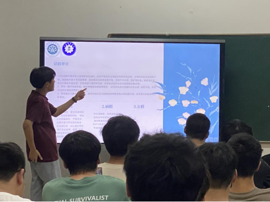 学院自律会会长蔡火旺、宿管部部长倪凯迪详细介绍了学生日常行为规范、宿舍纪律等校规校纪,全面向2024级学生普及校规校纪知识。结合实际案例,对上课纪律、宿舍检查标准、晚查寝、违纪处分等方面作了细致解读,引导全体新生遵守校规校纪、做“有纪律、守规矩”的合格大学生。
