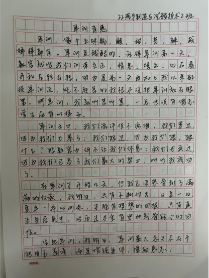 俗话说:“不经历风雨,何以见彩虹?”“立正、稍息、向左走、向右.......一遍又一遍的重复着这些滚瓜烂熟的动作。路途中遇到困难,勇敢的越过.....多少次让泪水划过脸庞,多少次让放弃的念头在脑海中荡漾,多少次让反抗的心里呈现在眼前,这时,就不由自主的拷问自己,来这里的目的是什么?答案是来这里磨练自己、锻炼自己。此时,我都会大声的告诉自己“坚持,就是胜利”。