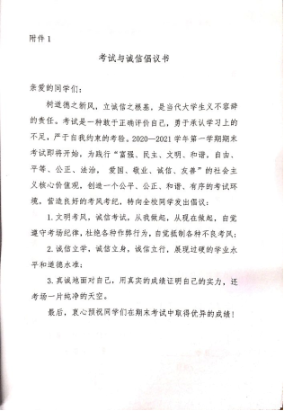 本次活动在2021年1月3日由辅导员带领各班级、团支部开展诚信及安全主题班会,通过主题班会和诚信与安全专题讲座等形式,对学生进行诚信安全教育,进一步引导学生更加坚定理想信念。在学校期间,考试期间就是学生的一个诚信体现。因此我系组织了全系学生签《考试与诚信承诺书》,加强学生的诚信意识和诚信素质。