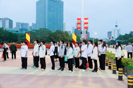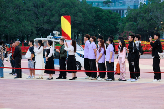 在福州五一广场,学生党支部组织学生党员、入党积极分子、优秀团员代表列队在国旗台前等待升旗仪式。伴随着雄壮激昂的《义勇军进行曲》,国旗与第一缕阳光一同升起。