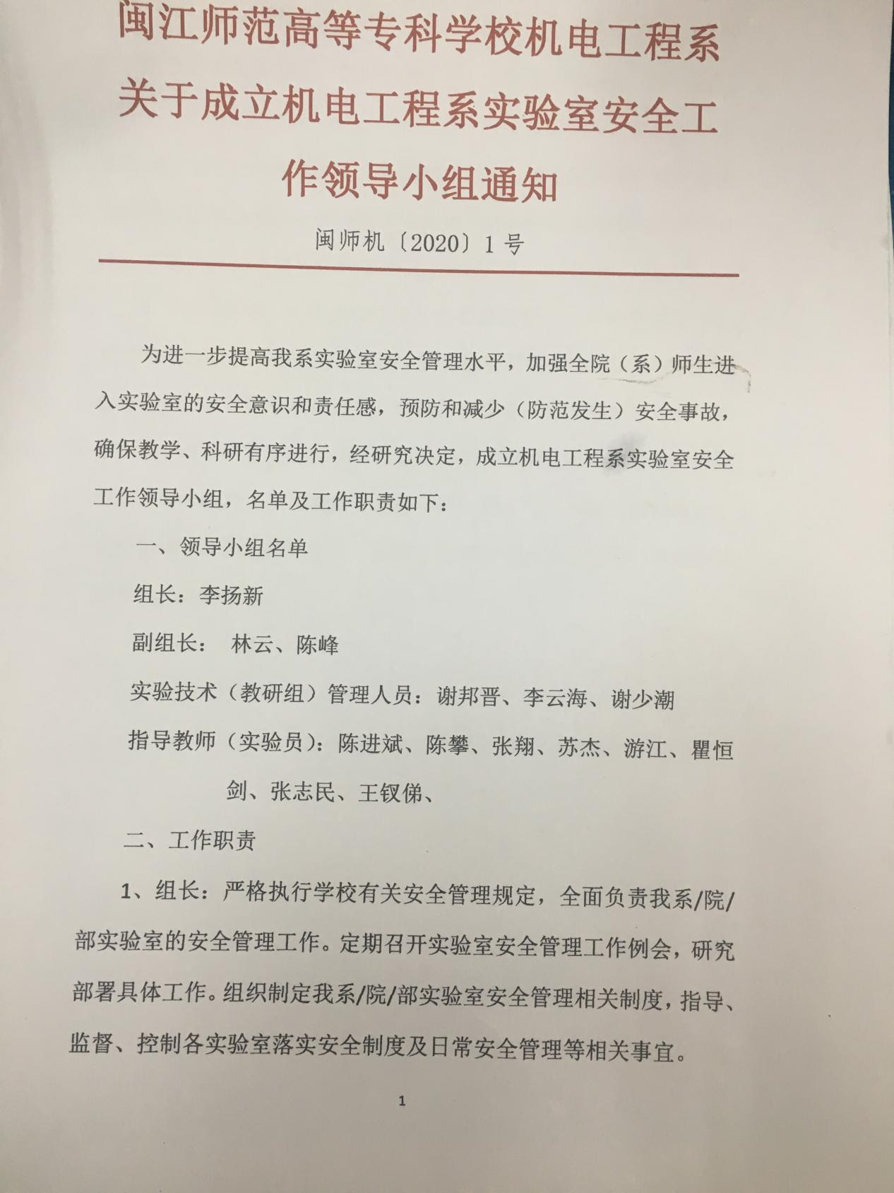 为进一步提高我系实验室安全管理水平,加强全院(系)师生进入实验室的安全意识和责任感,预防和减少(防范发生)安全事故,确保教学、科研有序进行,经研究决定,成立机电工程系实验室安全工作领导小组,名单及工作职责如下: