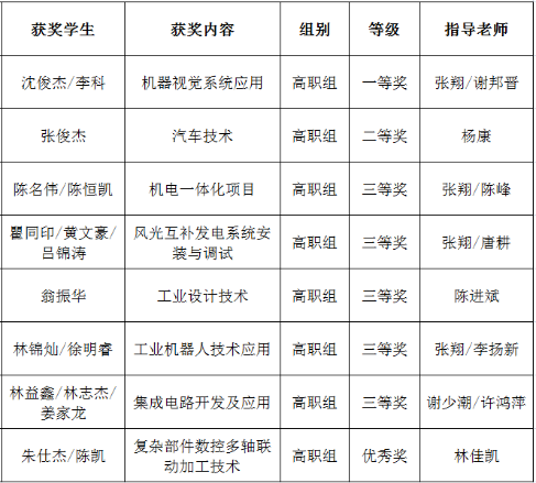 智能制造学院2023年福建省职业院校技能大赛获奖一览表