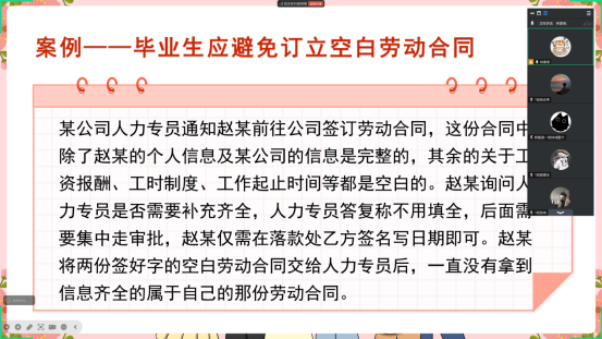 随后,辅导员们进行就业权益保护知识宣讲。通过具体案例剖析毕业生在求职过程中可能遭遇的合同陷阱、薪资纠纷、虚假招聘等问题。强调毕业生在签订就业协议和劳动合同时,要仔细阅读条款内容,明确双方权利与义务,警惕不合理条款。同时,还分享了遭遇侵权时的维权途径和方法,如向劳动监察部门投诉、申请劳动仲裁等,为毕业生的就业之路筑牢法律防线。