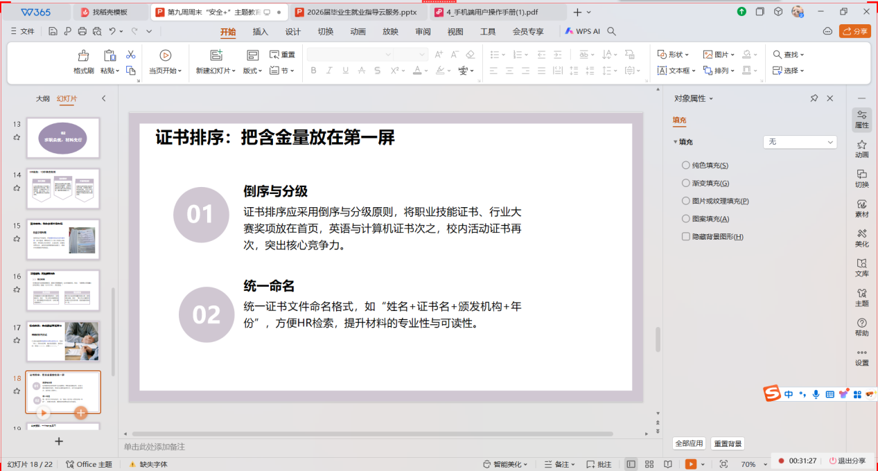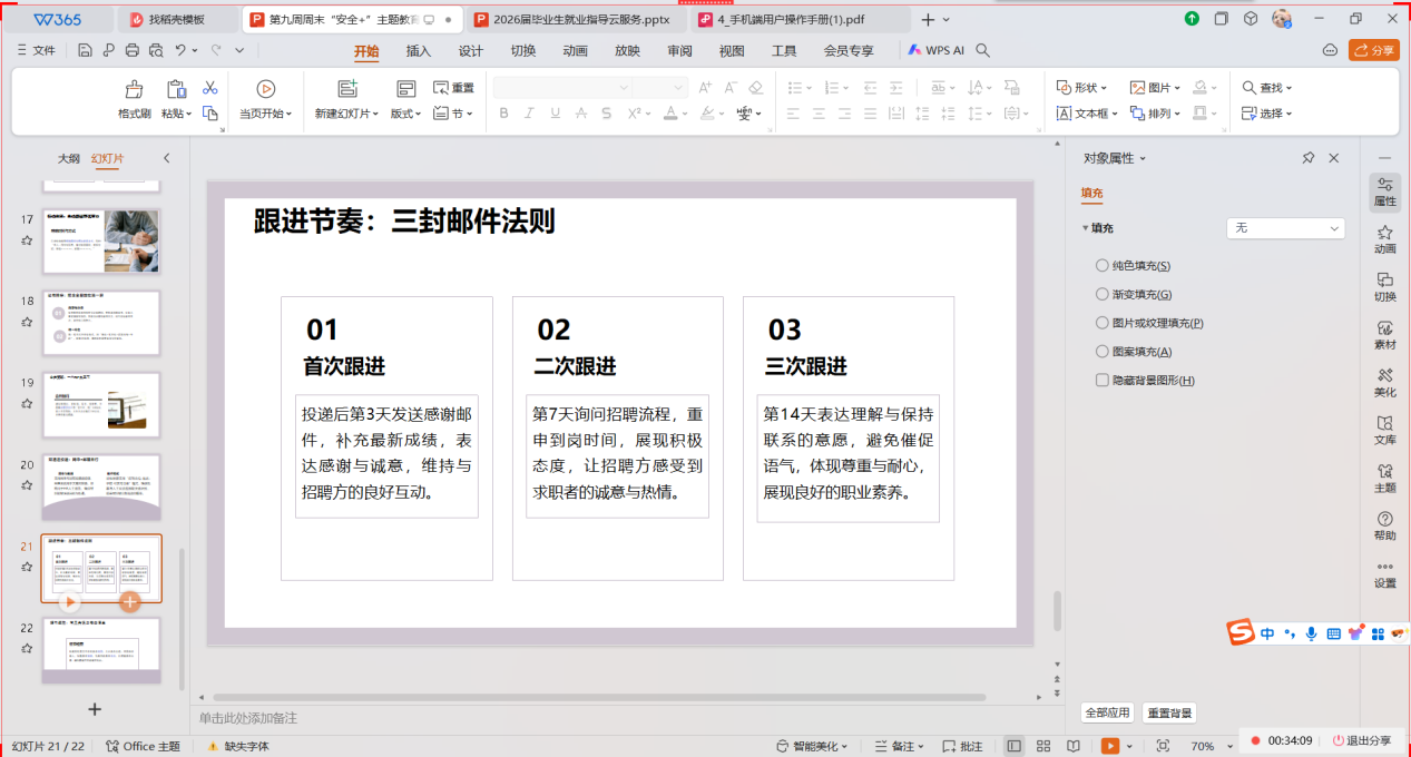 最后,辅导员分析了跟进策略,跟进环节遵循“三封邮件法则”。此外,活动还提醒毕业班学生在投递前检查文件命名、大小、书签、标题、礼貌用语及时间戳,避免因细节失误错失机会。