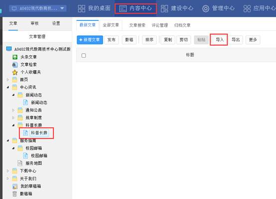 2、示例:导入到站点“现代教育技术中心”中的栏目“科普长廊”。