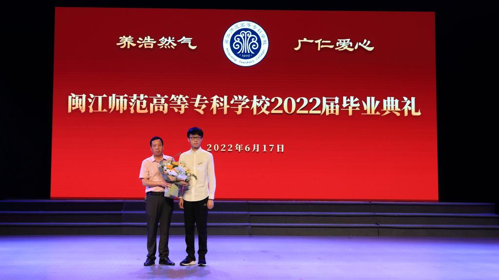 毕业典礼在庄严的国歌声中拉开帷幕。谢敏峰宣读《闽江师范高等专科学校关于准予2022届学生毕业的决定》;林旻宣读《闽江师范高等专科学校关于表彰2022届优秀毕业生的决定》。在热烈的掌声中,校领导为毕业生代表颁发毕业证书和优秀毕业生荣誉证书。