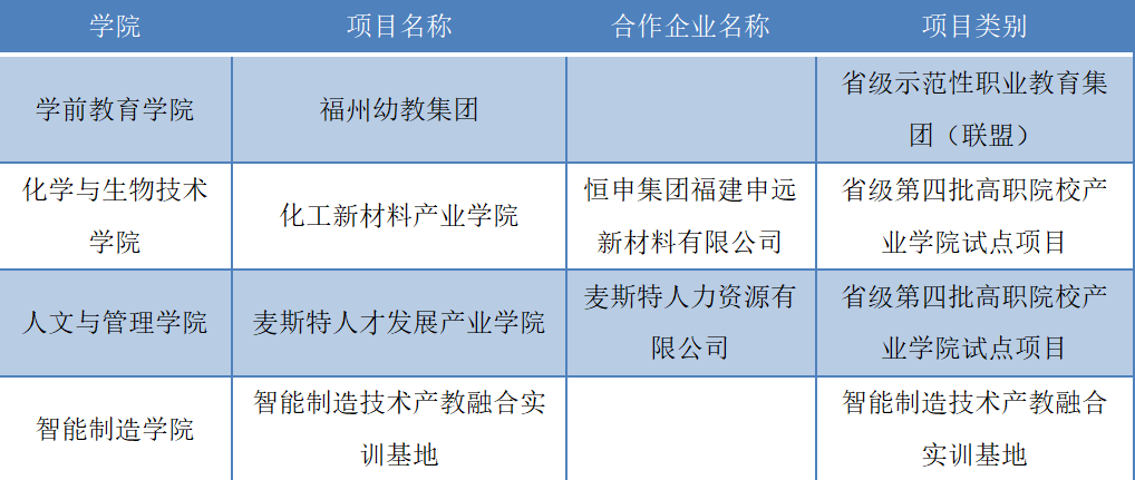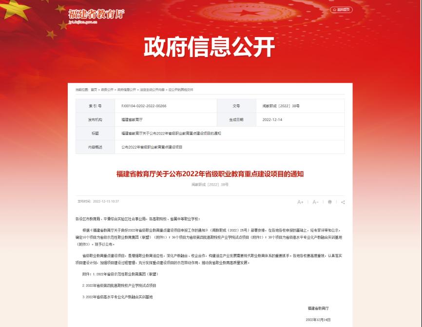 日前,福建省教育厅公布2022年省级职业教育重点建设项目,我校学前教育学院的福州幼教集团入选2022年省级示范性职业教育集团(联盟);化学与生物技术学院的化工新材料产业学院、人文与管理学院的麦斯特人才发展产业学院立项为2022年省级第四批高职院校产业学院试点项目;智能制造学院的智能制造技术产教融合实训基地确认为省级高水平专业化产教融合实训基地。