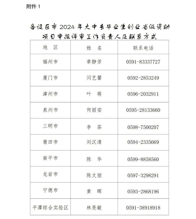 1.各设区市2024年大中专毕业生创业省级资助项目申报评审工作负责人及联系方式