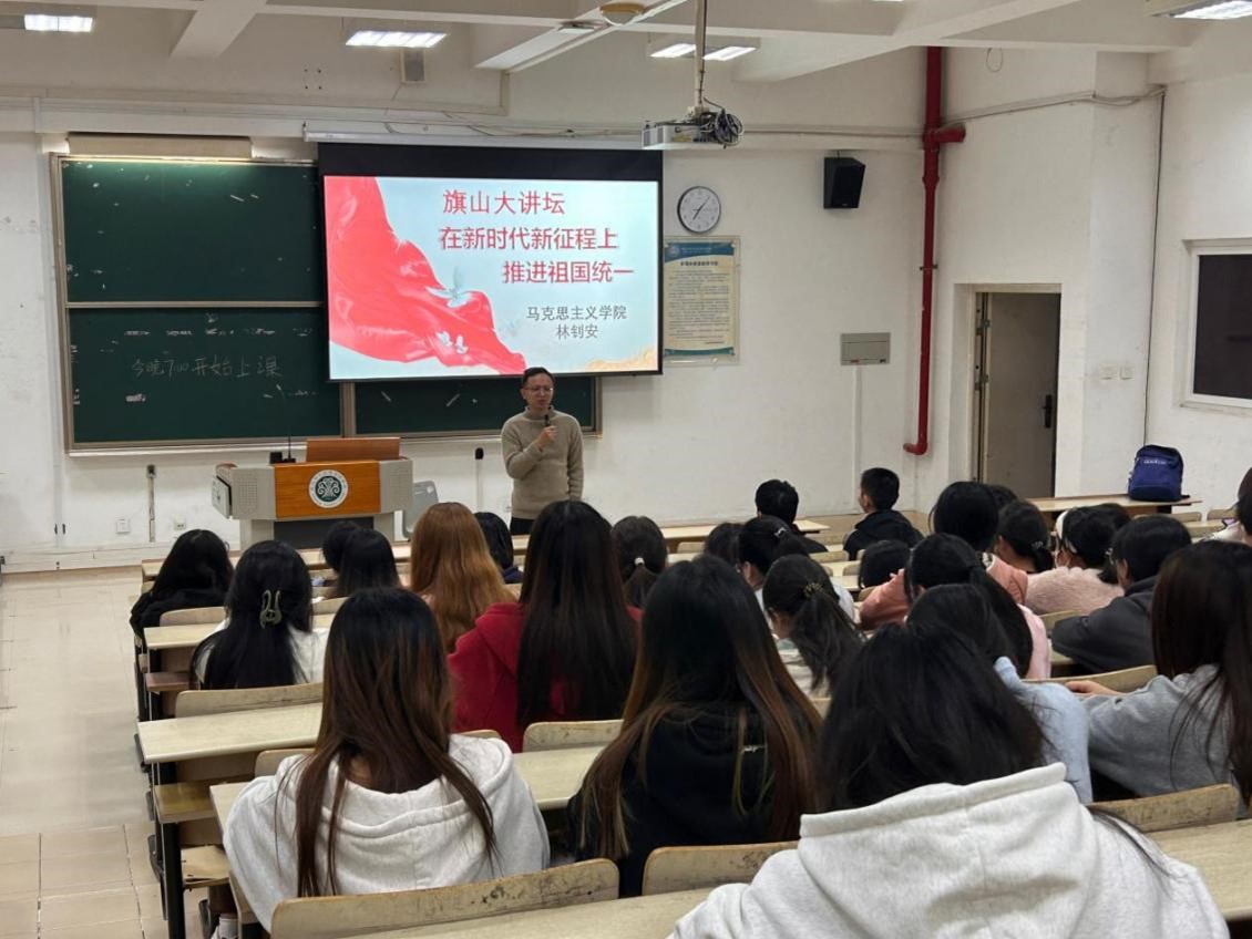 11月27日,“旗山大讲坛”在旗山校区教学楼1014开讲,林钊安老师为小学教育学院2023级语文教育2班学生做题为“在新时代新征程上推进祖国统一”专题讲座。