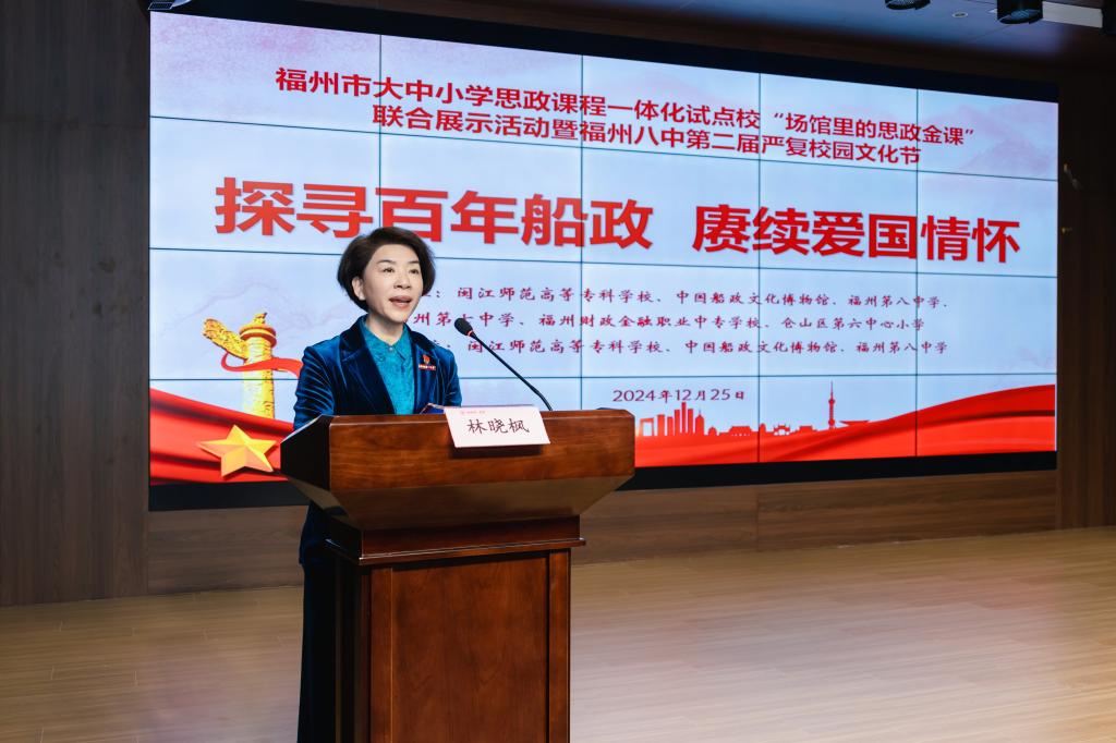 12月25日下午,我校作为牵头单位的福州市大中小学思政课程一体化试点校(第二组)以“探寻百年船政,赓续爱国情怀”为主题的“场馆里的思政金课”联合展示活动在中国船政文化博物馆成功举办。本次活动由福州市教育局指导,我校与试点校(第二组)其他四家成员单位福州第八中学、福州第七中学、福州财政金融职业中专学校、福州市仓山区第六中心小学以及中国船政文化博物馆联合主办,由我校、中国船政文化博物馆、福州第八中学联合承办。福建船政文化管理委员会党组书记、主任刘江远,福州市教育局思政处副处长吴翛珺,试点校(第二组)成员单位领导、师生代表100余人参加活动。