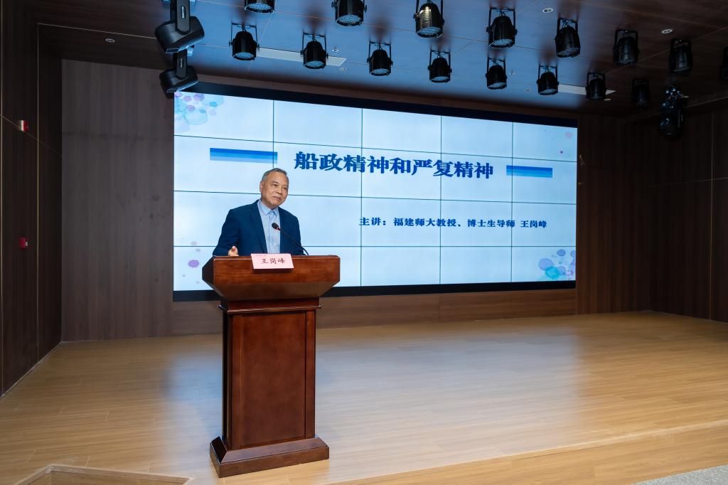 福建师范大学马克思主义学院博士生导师王岗峰教授为大家带来“船政精神和严复精神”的精彩讲座。王教授不仅详细阐述了船政文化深厚的历史底蕴,更从多个维度剖析了船政精神中蕴含的爱国、自强、创新等核心价值。王教授的讲座内容丰富、语言深邃,既有理论的深度,又不乏实践的温度,让在场师生深受启发,对船政文化及其当代价值有了更加全面而深刻的认识。